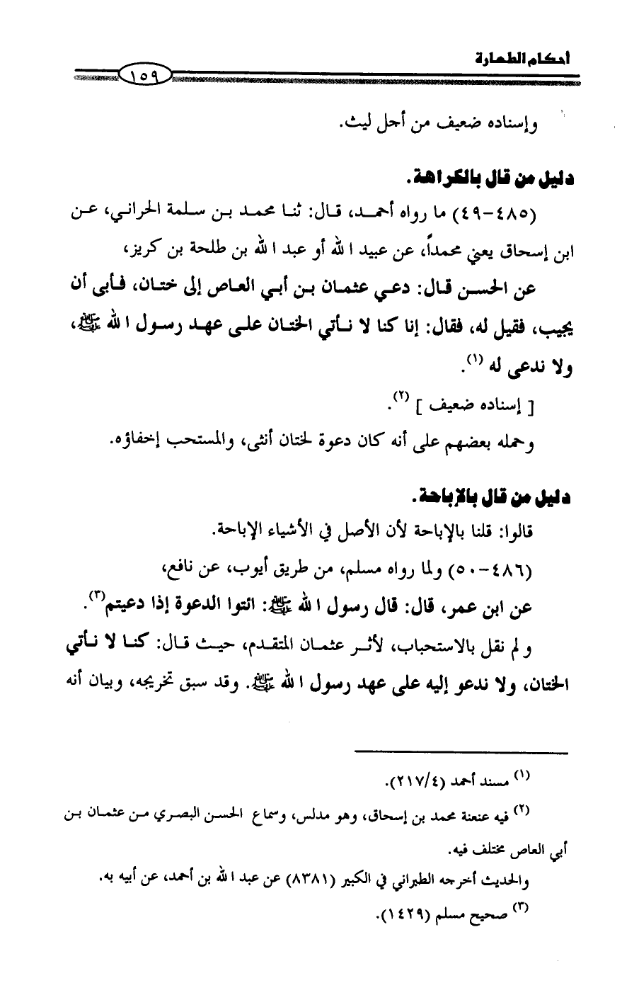 ولم نقل بالاستحباب، لأثر عثمان المتقدم، حيث قال: كنا لا نأتي الختان، ولا ندعو إليه على عهد رسول الله - صلى الله عليه وسلم -. وقد سبق تخريجه، وبيان أنه