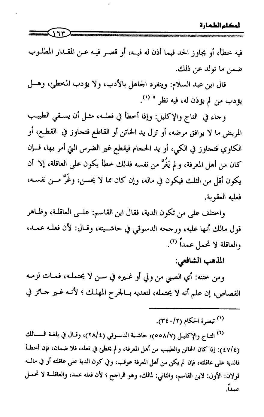 (¬2) التاج والإكليل (7/ 558)، حاشية الدسوقي (4/ 28)، وقال في بلغة السالك (4/ 47): إذا كان الخاتن والطبيب من أهل المعرفة، ولم يخطئ في فعله، فلا ضمان، فإن أخطأ فالدية على عاقلته، فإن لم يكن من أهل المعرفة عوقب، وفي كون الدية على عاقلته أو في ماله قولان: الأول: لابن القاسم، والثاني: لمالك، وهو الراجح؛ لأن فعله عمد، والعاقلة لا تحمل عمداً.