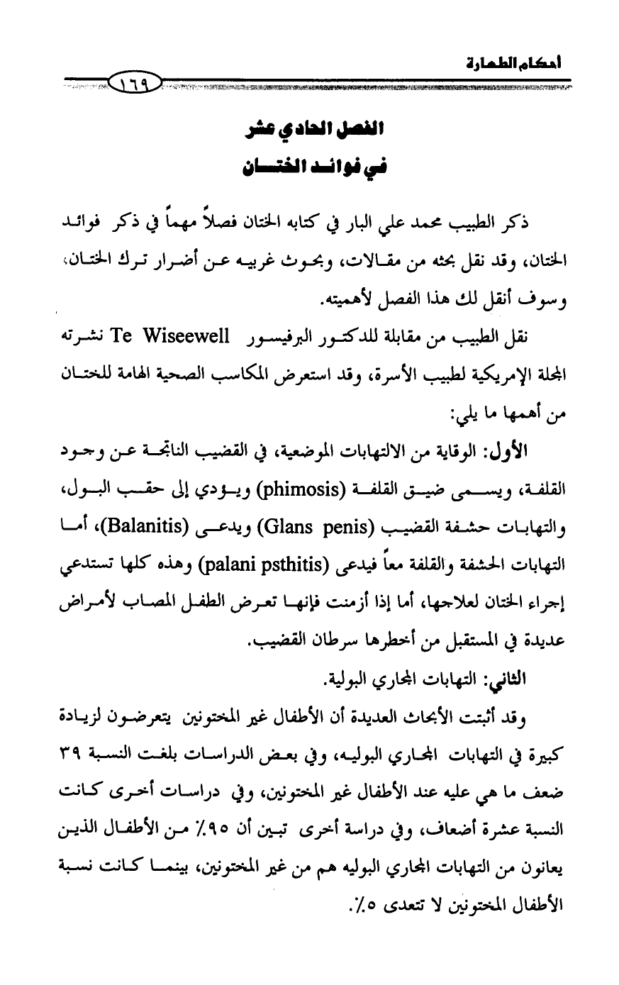 ذكر الطبيب محمد علي البار في كتابه الختان فصلاً مهماً في ذكر فوائد الختان، وقد نقل بحثه من مقالات، وبحوث غربية عن أضرار ترك الختان، وسوف أنقل لك هذا الفصل لأهميته.