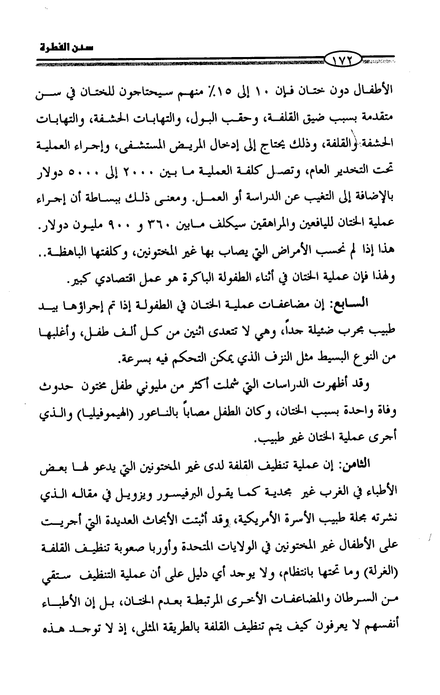 السابع: إن مضاعفات عملية الختان في الطفولة إذا تم إجراؤها بيد طبيب مجرب ضئيلة جداً، وهي لا تتعدى اثنين من كل ألف طفل، وأغلبها من النوع البسيط مثل النزف الذي يمكن التحكم فيه بسرعة.