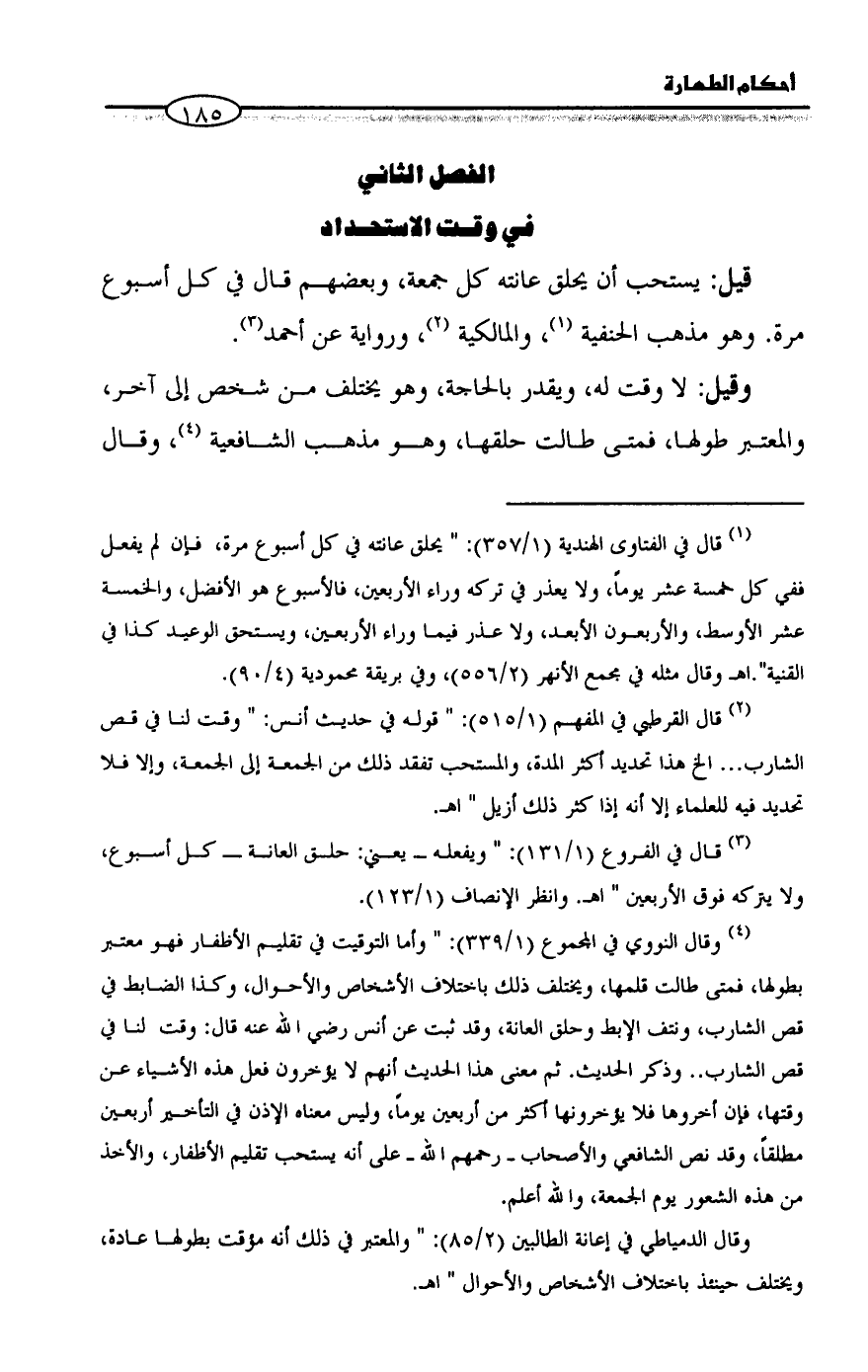 (¬4) وقال النووي في المجموع (1/ 339): " وأما التوقيت في تقليم الأظفار فهو معتبر بطولها، فمتى طالت قلمها، ويختلف ذلك باختلاف الأشخاص والأحوال، وكذا الضابط في قص الشارب، ونتف الإبط وحلق العانة، وقد ثبت عن أنس رضي الله عنه قال: وقت لنا في قص الشارب .. وذكر الحديث. ثم معنى هذا الحديث أنهم لا يؤخرون فعل هذه الأشياء عن وقتها، فإن أخروها فلا يؤخرونها أكثر من أربعين يوماً، وليس معناه الإذن في التأخير أربعين مطلقاً، وقد نص الشافعي والأصحاب ـ رحمهم الله ـ على أنه يستحب تقليم الأظفار، والأخذ من هذه الشعور يوم الجمعة، والله أعلم.