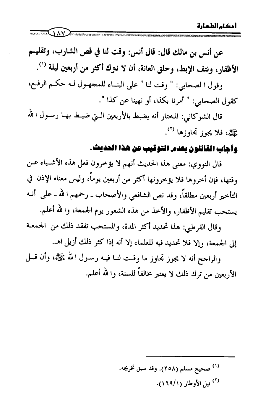 عن أنس بن مالك قال: قال أنس: وقت لنا في قص الشارب، وتقليم الأظفار، ونتف الإبط، وحلق العانة، أن لا نترك أكثر من أربعين ليلة (¬1).