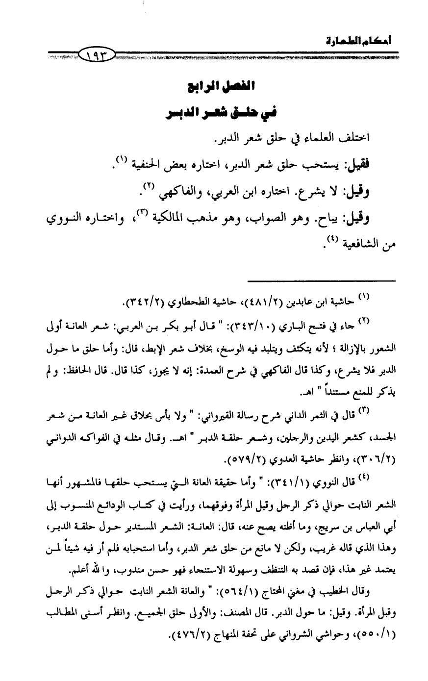 (¬2) جاء في فتح الباري (10/ 343): " قال أبو بكر بن العربي: شعر العانة أولى الشعور بالإزالة؛ لأنه يتكثف ويتلبد فيه الوسخ، بخلاف شعر الإبط، قال: وأما حلق ما حول الدبر فلا يشرع، وكذا قال الفاكهي في شرح العمدة: إنه لا يجوز، كذا قال. قال الحافظ: ولم يذكر للمنع مستنداً " اهـ