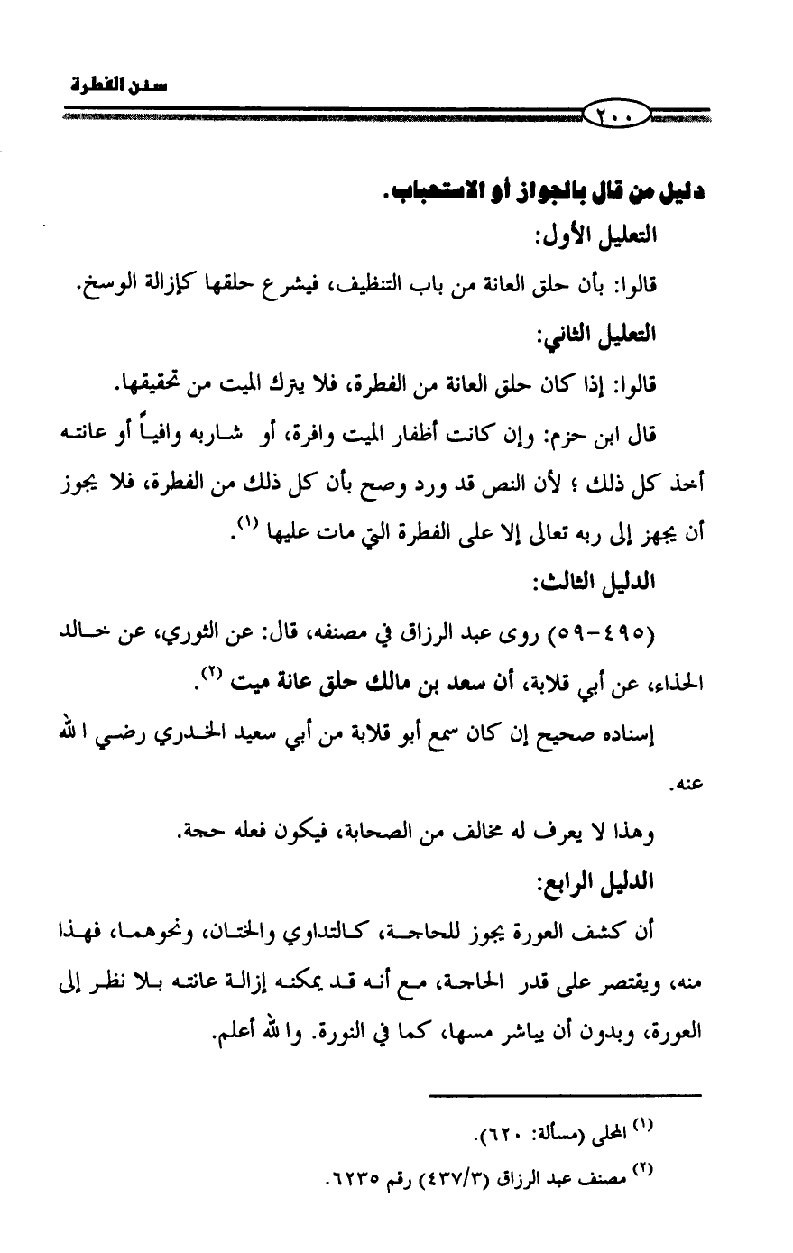 (495 - 59) روى عبد الرزاق في مصنفه، قال: عن الثوري، عن خالد الحذاء، عن أبي قلابة، أن سعد بن مالك حلق عانة ميت (¬2).