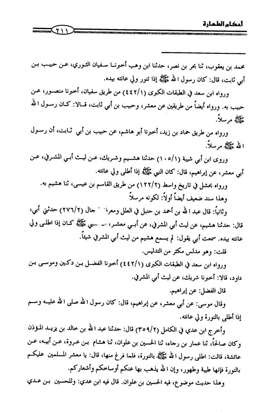 وثانياُ: قال عبد الله بن أحمد بن حنبل في العلل ومعرفة الرجال (2/ 276) حدثني أبي، قال: حدثنا هشيم، عن ليث أبي المشرفي، عن أبي معشر، أن النبي - صلى الله عليه وسلم - كان إذا اطلى ولي عانته بيده. سمعت أبي يقول: لم يسمع هشيم من ليث أبي المشرفي شيئاً.