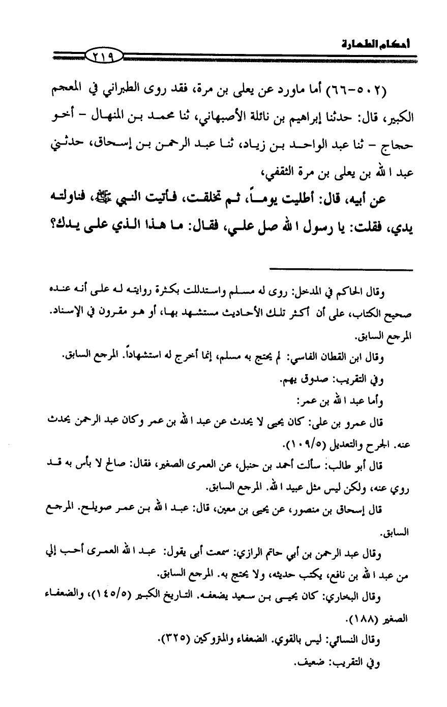 (502 - 66) أما ماورد عن يعلى بن مرة، فقد روى الطبراني في المعجم الكبير، قال: حدثنا إبراهيم بن نائلة الأصبهاني، ثنا محمد بن المنهال - أخو حجاج - ثنا عبد الواحد بن زياد، ثنا عبد الرحمن بن إسحاق، حدثني عبد الله بن يعلى بن مرة الثقفي،