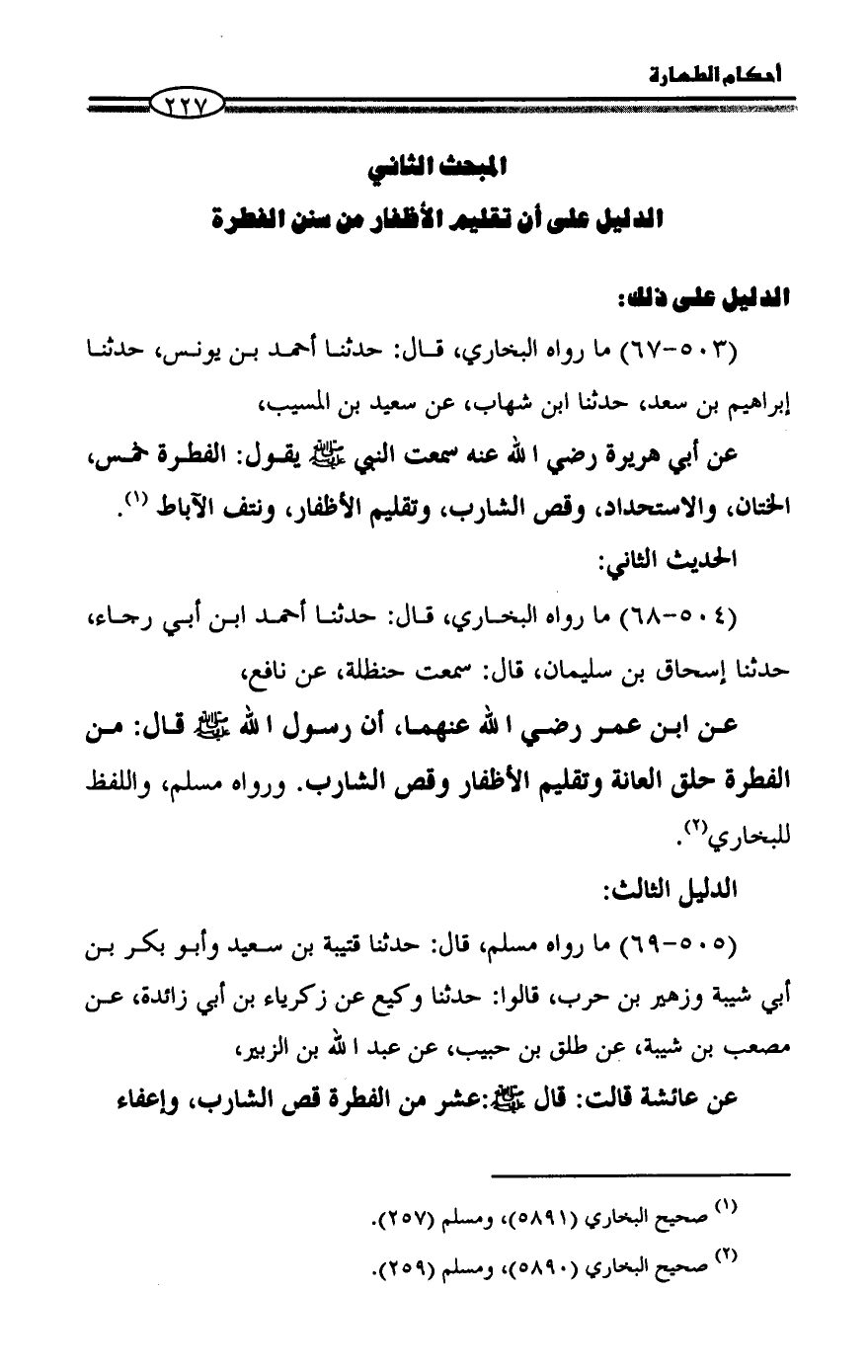 عن ابن عمر رضي الله عنهما، أن رسول الله - صلى الله عليه وسلم - قال: من الفطرة حلق العانة وتقليم الأظفار وقص الشارب. ورواه مسلم، واللفظ للبخاري (¬2).