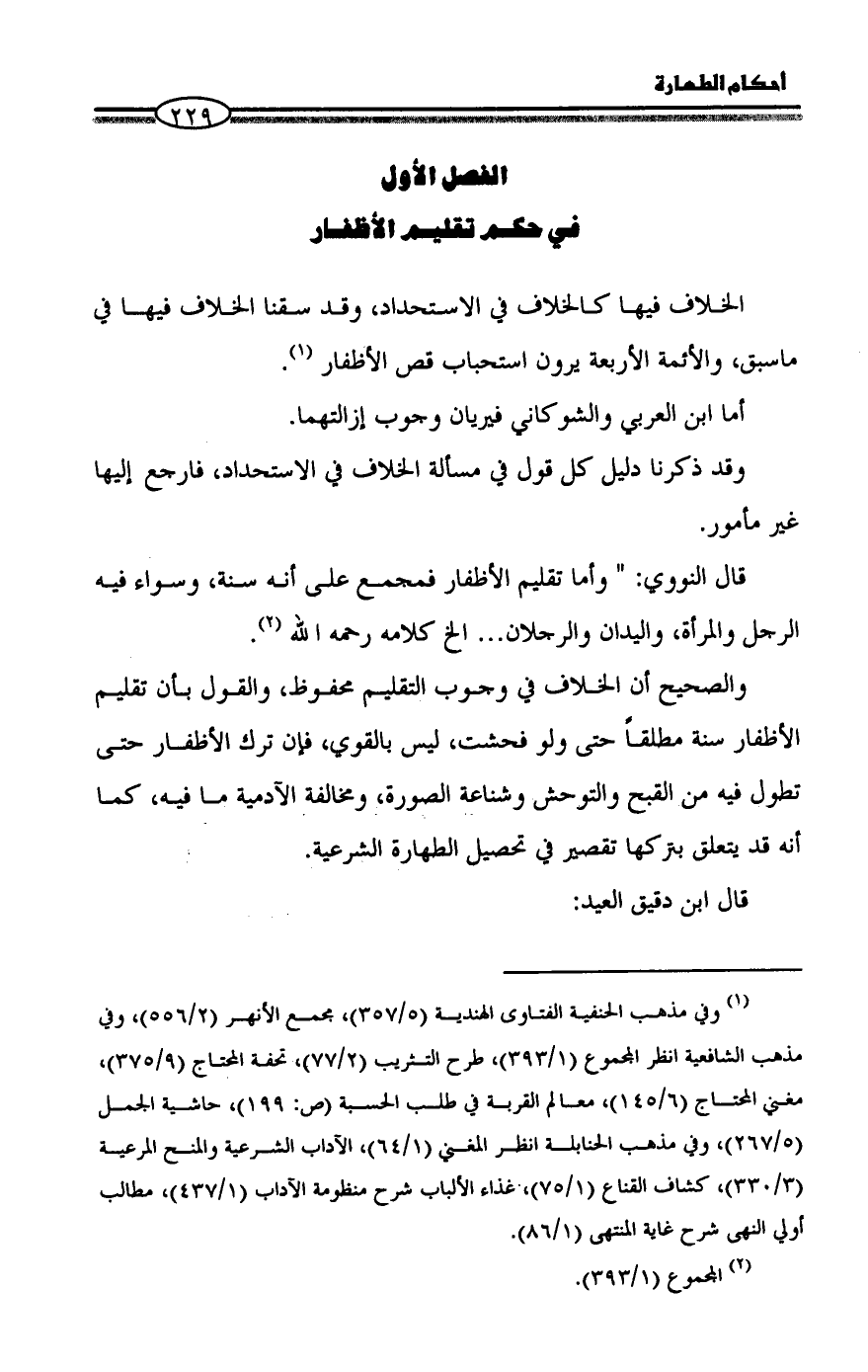 قال النووي: " وأما تقليم الأظفار فمجمع على أنه سنة، وسواء فيه الرجل والمرأة، واليدان والرجلان ... الخ كلامه رحمه الله (¬2).