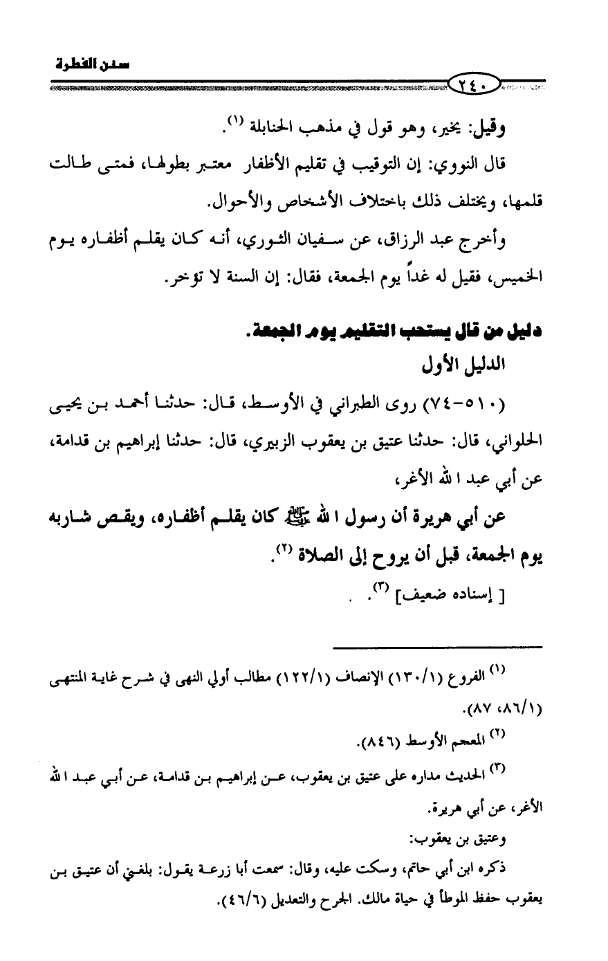 وأخرج عبد الرزاق، عن سفيان الثوري، أنه كان يقلم أظفاره يوم الخميس، فقيل له غداً يوم الجمعة، فقال: إن السنة لا تؤخر.