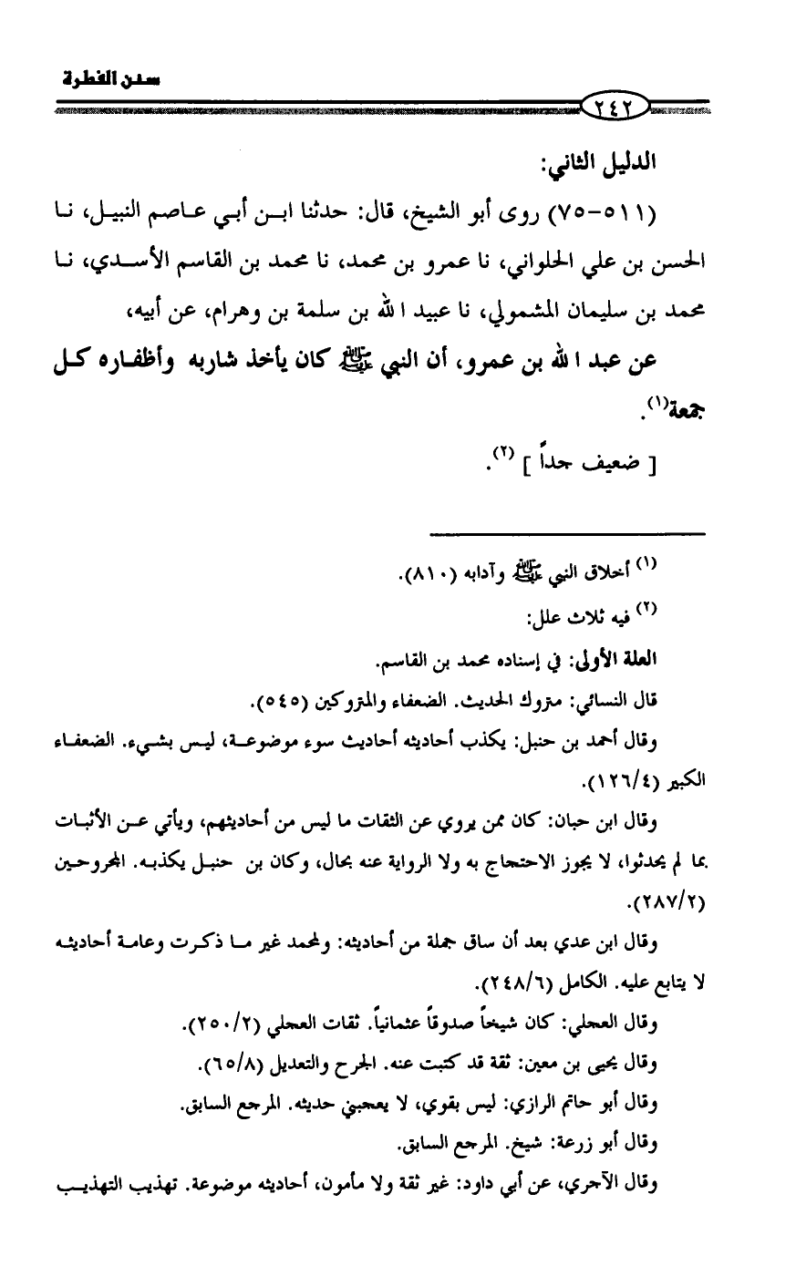 عن عبد الله بن عمرو، أن النبي - صلى الله عليه وسلم - كان يأخذ شاربه وأظفاره كل جمعة (¬1).