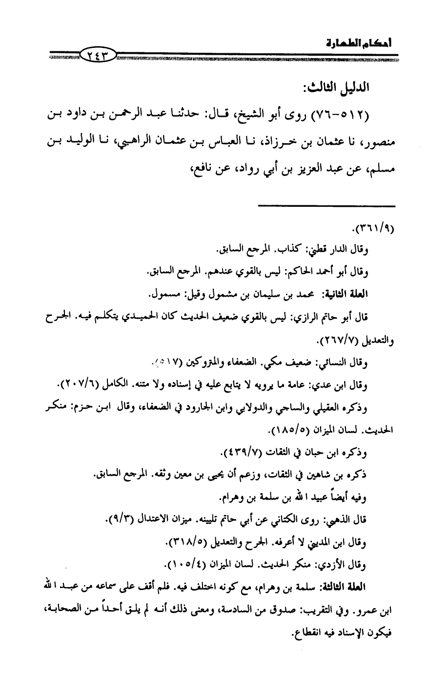 (512 - 76) روى أبو الشيخ، قال: حدثنا عبد الرحمن بن داود بن منصور، نا عثمان بن خرزاذ، نا العباس بن عثمان الراهبي، نا الوليد بن مسلم، عن عبد العزيز بن أبي رواد، عن نافع،