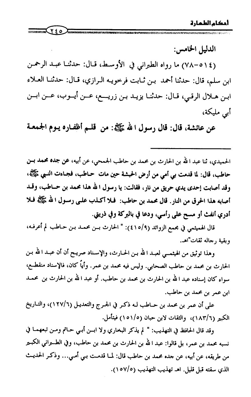 (514 - 78) ما رواه الطبراني في الأوسط، قال: حدثنا عبد الرحمن بن سلم، قال: حدثنا أحمد بن ثابت فرخويه الرازي، قال: حدثنا العلاء بن هلال الرقي، قال: حدثنا يزيد بن زريع، عن أيوب، عن ابن أبي مليكة،