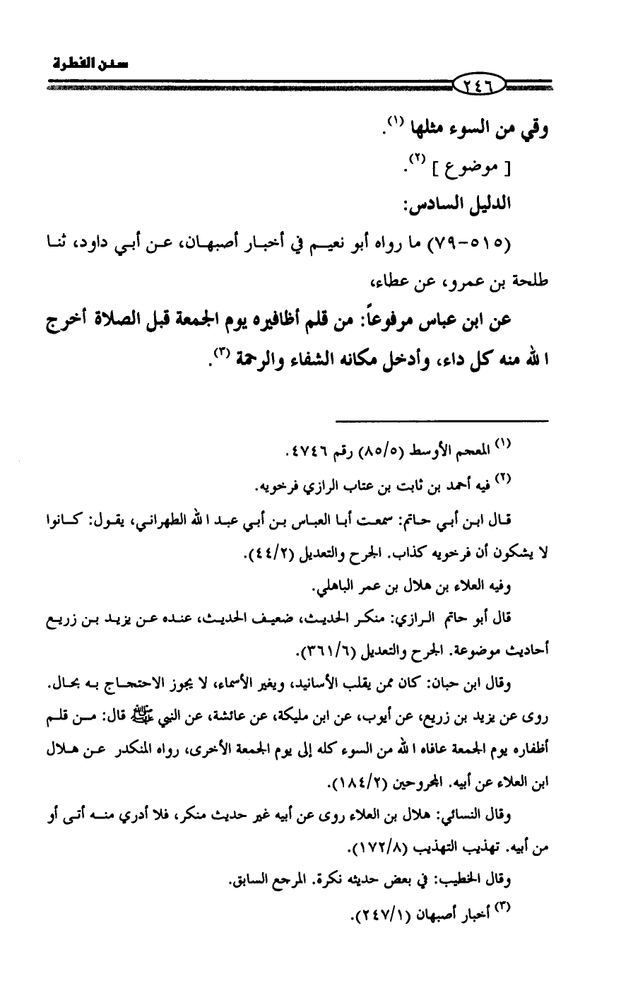 عن ابن عباس مرفوعاً: من قلم أظافيره يوم الجمعة قبل الصلاة أخرج الله منه كل داء، وأدخل مكانه الشفاء والرحمة (¬3).