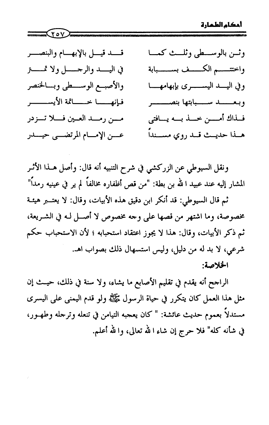 ونقل السيوطي عن الزركشي في شرح التنبيه أنه قال: وأصل هذا الأثر المشار إليه عند عبيد الله بن بطة: " من قص أظفاره مخالفاً لم ير في عينيه رمداً "