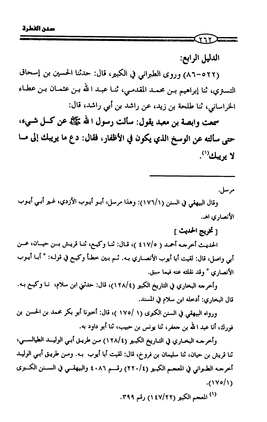 سمعت وابصة بن معبد يقول: سألت رسول الله - صلى الله عليه وسلم - عن كل شيء، حتى سألته عن الوسخ الذي يكون في الأظفار، فقال: دع ما يريبك إلى ما لا يريبك (¬1).