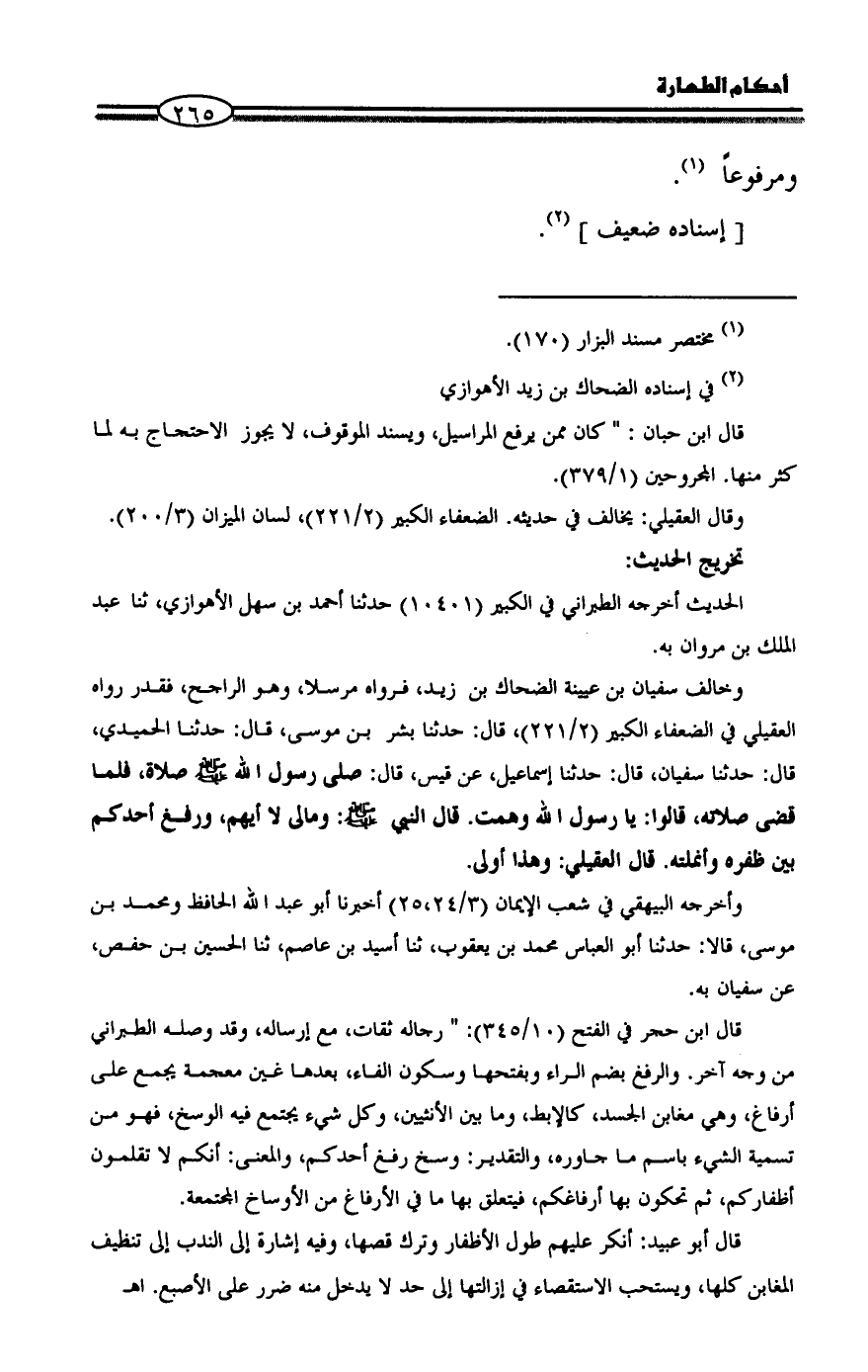 وخالف سفيان بن عيينة الضحاك بن زيد، فرواه مرسلا، وهو الراجح، فقدر رواه العقيلي في الضعفاء الكبير (2/ 221)، قال: حدثنا بشر بن موسى، قال: حدثنا الحميدي، قال: حدثنا سفيان، قال: حدثنا إسماعيل، عن قيس، قال: صلى رسول الله - صلى الله عليه وسلم - صلاة، فلما قضى صلاته، قالوا: يا رسول الله وهمت. قال النبي - صلى الله عليه وسلم -: ومالى لا أيهم، ورفغ أحدكم بين ظفره وأنملته. قال العقيلي: وهذا أولى.