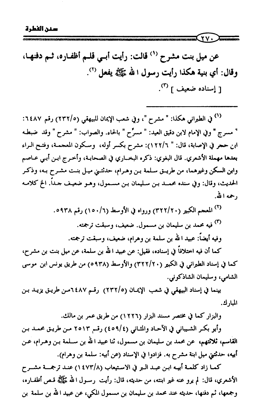 (¬1) في الطبراني هكذا: " مشرح "، وفي شعب الإيمان للبيهقي (5/ 232) رقم 6487: " مسرج " وفي الإمام لابن دقيق العيد: " مسرِّح " بالحاء. والصواب: " مشرح " وقد ضبطه ابن حجر في الإصابة، قال: " 6/ 122): مشرح بكسر أوله، وسكون المعجمة، وفتح الراء بعدها مهملة الأشعري. قال البغوي: ذكره البخاري في الصحابة، وأخرج ابن أبي عاصم وابن السكن وغيرهما، من طريق سلمة بن وهرام، حدثتني ميل بنت مشرح به، وذكر الحديث، وقال: وفي سنده محمد بن سليمان بن مسمول، وهو ضعيف جداً. الخ كلامه رحمه الله.