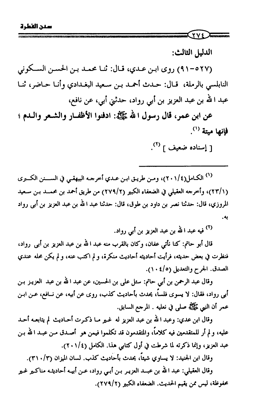 (¬1) الكامل (4/ 201)، ومن طريق ابن عدي أخرجه البيهقي في السنن الكبرى (1/ 23)، وأخرجه العقيلي في الضعفاء الكبير (2/ 279) من طريق أحمد بن محمد بن سعيد المروزي، قال: حدثنا نصر بن داود بن طوق، قال: حدثنا عبد الله بن عبد العزيز بن أبى رواد به.