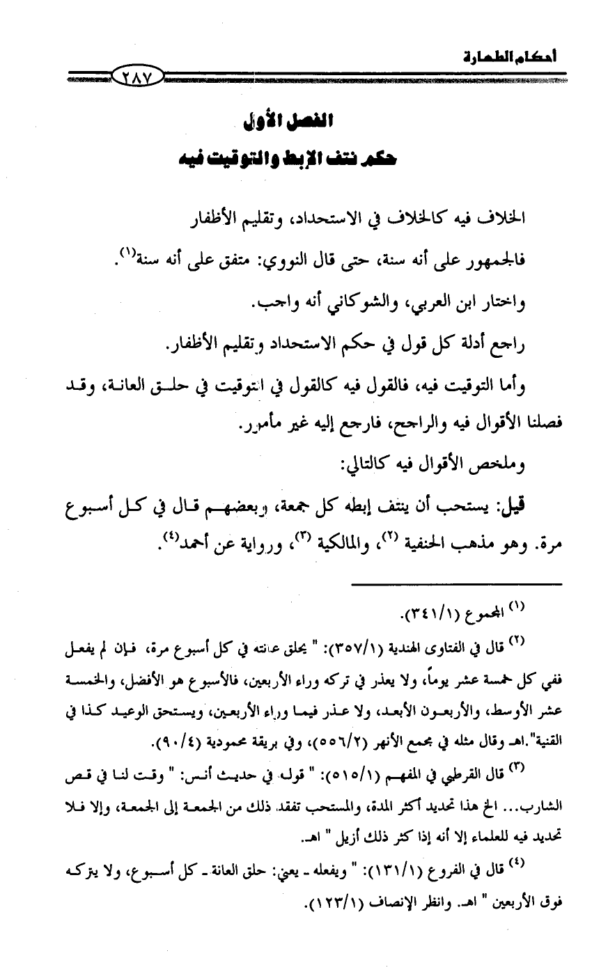 (¬4) قال في الفروع (1/ 131): " ويفعله ـ يعني: حلق العانة ـ كل أسبوع، ولا يتركه فوق الأربعين " اهـ. وانظر الإنصاف (1/ 123).