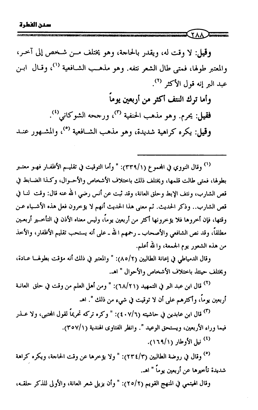 (¬2) قال ابن عبد البر في التمهيد (21/ 68): " ومن أهل العلم من وقت في حلق العانة أربعين يوماً، وأكثرهم على أن لا توقيت في شيء من ذلك ". اهـ