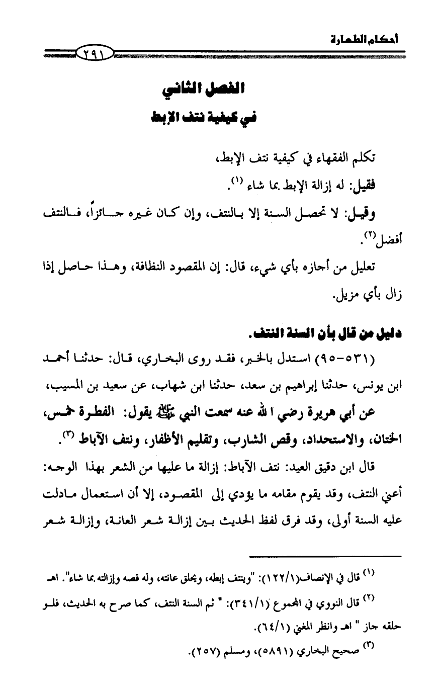 عن أبي هريرة رضي الله عنه سمعت النبي - صلى الله عليه وسلم - يقول: الفطرة خمس، الختان، والاستحداد، وقص الشارب، وتقليم الأظفار، ونتف الآباط (¬3).