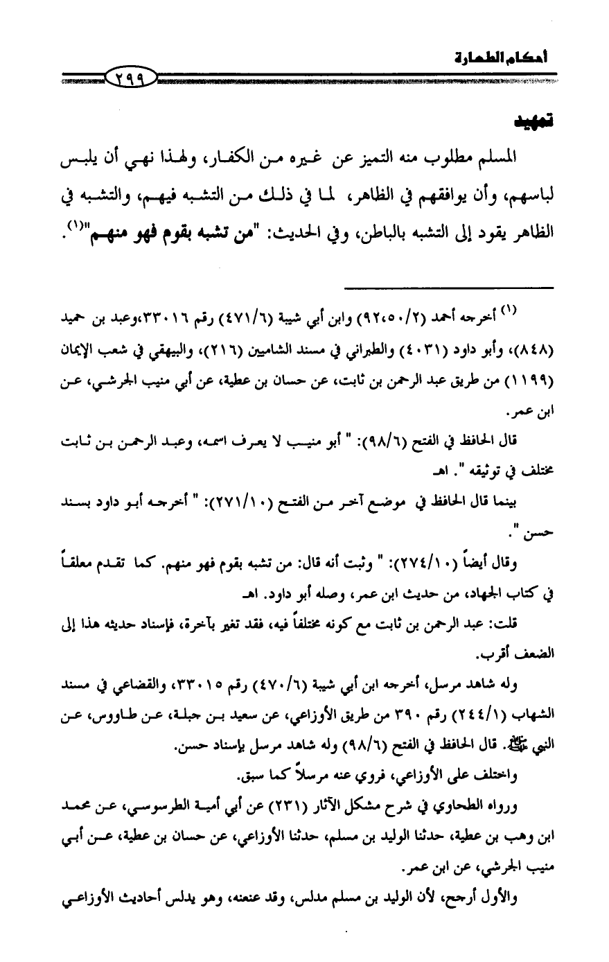 وقال أيضاً (10/ 274): " وثبت أنه قال: من تشبه بقوم فهو منهم. كما تقدم معلقاً في كتاب الجهاد، من حديث ابن عمر، وصله أبو داود. اهـ