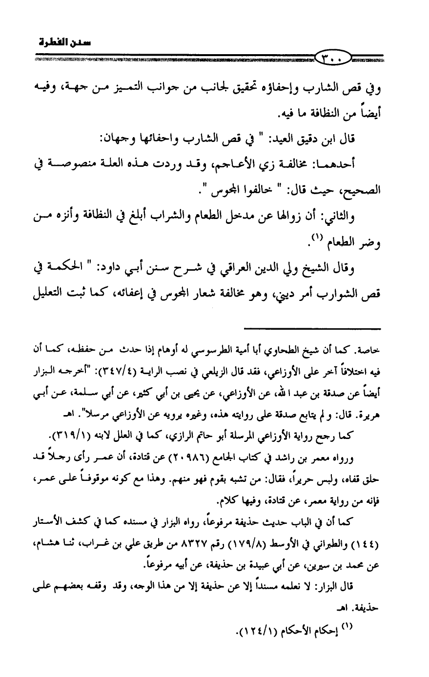وقال الشيخ ولي الدين العراقي في شرح سنن أبي داود: " الحكمة في قص الشوارب أمر ديني، وهو مخالفة شعار المجوس في إعفائه، كما ثبت التعليل