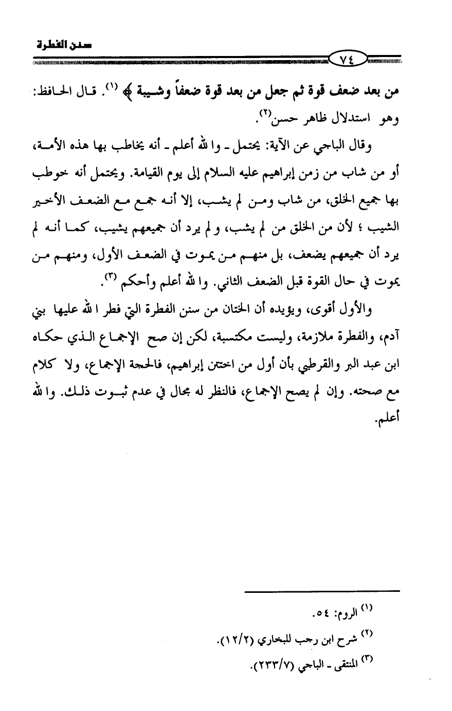 من بعد ضعف قوة ثم جعل من بعد قوة ضعفاً وشيبة} (¬1). قال الحافظ: وهو استدلال ظاهر حسن (¬2).