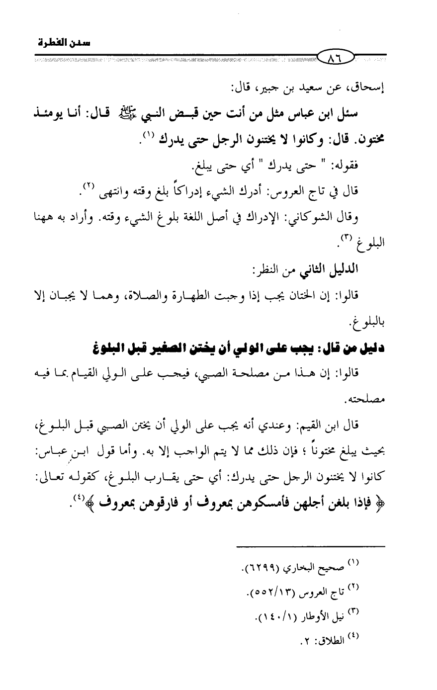 قال ابن القيم: وعندي أنه يجب على الولي أن يختن الصبي قبل البلوغ، بحيث يبلغ مختوناً؛ فإن ذلك مما لا يتم الواجب إلا به. وأما قول ابن عباس: كانوا لا يختنون الرجل حتى يدرك: أي حتى يقارب البلوغ، كقوله تعالى: