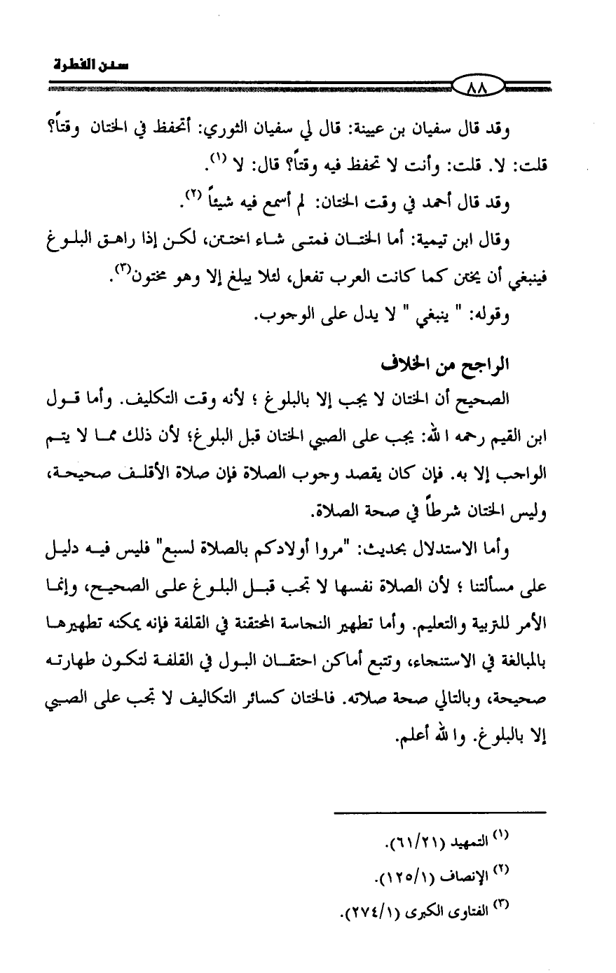 وأما الاستدلال بحديث: "مروا أولادكم بالصلاة لسبع" فليس فيه دليل على مسألتنا؛ لأن الصلاة نفسها لا تجب قبل البلوغ على الصحيح، وإنما الأمر للتربية والتعليم. وأما تطهير النجاسة المحتقنة في القلفة فإنه يمكنه تطهيرها بالمبالغة في الاستنجاء، وتتبع أماكن احتقان البول في القلفة لتكون طهارته صحيحة، وبالتالي صحة صلاته. فالختان كسائر التكاليف لا تجب على الصبي إلا بالبلوغ. والله أعلم.