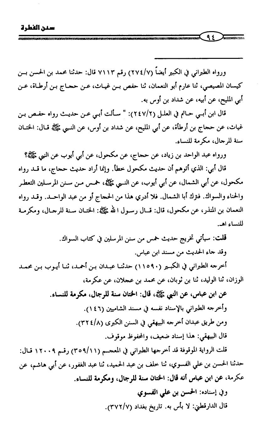 عن ابن عباس، عن النبي - صلى الله عليه وسلم -، قال: الختان سنة للرجال، مكرمة للنساء.