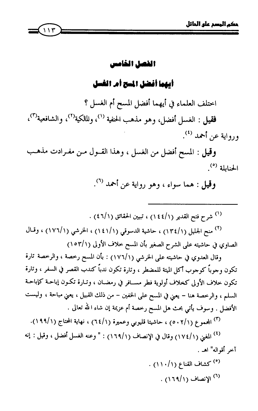 وقيل: المسح أفضل من الغسل، وهذا القول من مفرادت مذهب الحنابلة (¬5).