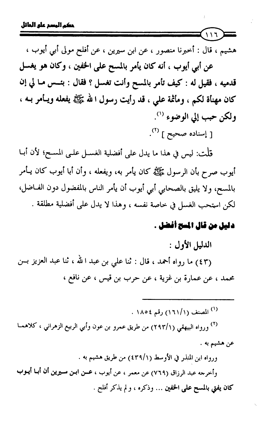 قلت: ليس في هذا ما يدل على أفضلية الغسل على المسح؛ لأن أبا أيوب صرح بأن الرسول - صلى الله عليه وسلم - كان يأمر به، ويفعله، وأن أبا أيوب كان يأمر بالمسح، ولا يليق بالصحابي أبي أيوب أن يأمر الناس بالمفضول دون الفاضل، لكن استحب الغسل في خاصة نفسه، وهذا لا يدل على أفضلية مطلقة.