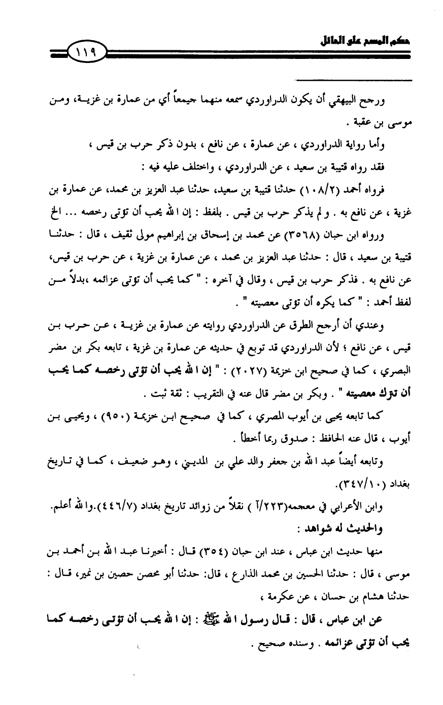 وعندي أن أرجح الطرق عن الدراوردي روايته عن عمارة بن غزية، عن حرب بن قيس، عن نافع؛ لأن الدراوردي قد توبع في حديثه عن عمارة بن غزية، تابعه بكر بن مضر البصري، كما في صحيح ابن خزيمة (2027): " إن الله يحب أن تؤتى رخصه كما يحب أن تترك معصيته ". وبكر بن مضر قال عنه في التقريب: ثقة ثبت.