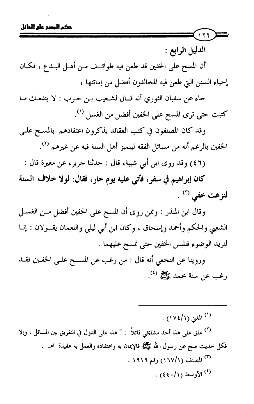 وروينا عن النخعي أنه قال: من رغب عن المسح على الخفين فقد رغب عن سنة محمد - صلى الله عليه وسلم - (¬4).