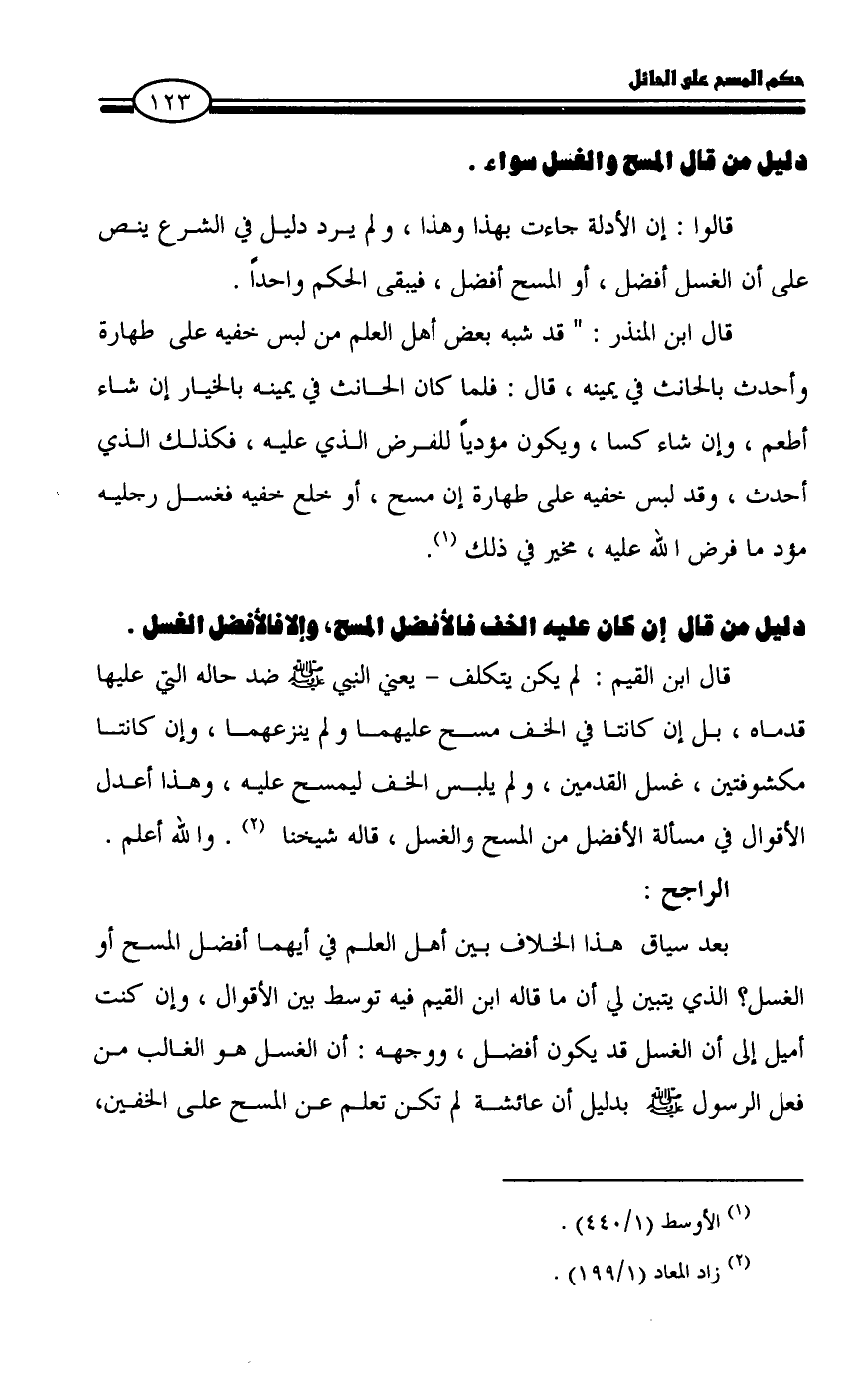 بعد سياق هذا الخلاف بين أهل العلم في أيهما أفضل المسح أو الغسل؟ الذي يتبين لي أن ما قاله ابن القيم فيه توسط بين الأقوال، وإن كنت أميل إلى أن الغسل قد يكون أفضل، ووجهه: أن الغسل هو الغالب من فعل الرسول - صلى الله عليه وسلم - بدليل أن عائشة لم تكن تعلم عن المسح على الخفين،