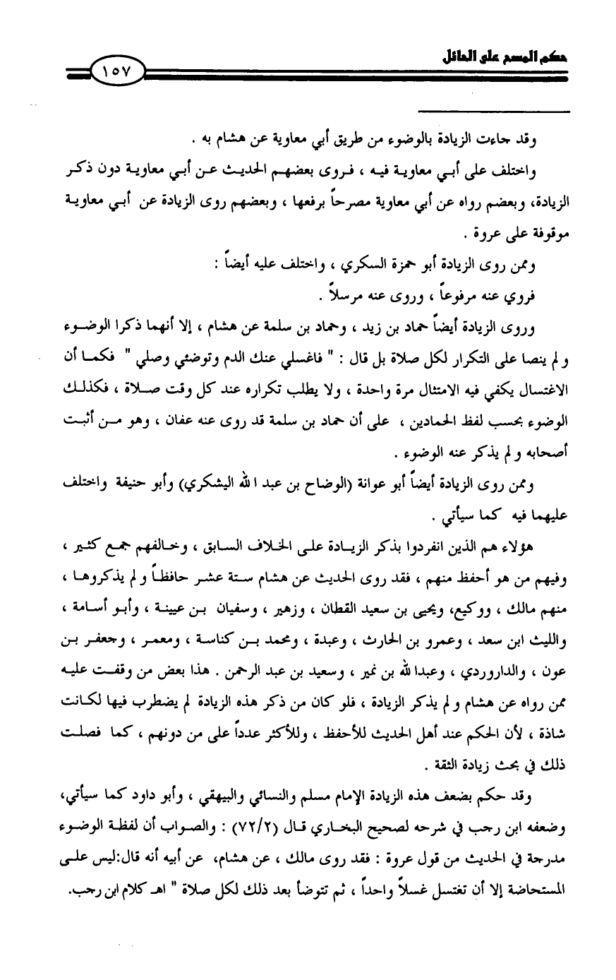 وروى الزيادة أيضاً حماد بن زيد، وحماد بن سلمة عن هشام، إلا أنهما ذكرا الوضوء ولم ينصا على التكرار لكل صلاة بل قال: " فاغسلي عنك الدم وتوضئي وصلي " فكما أن الاغتسال يكفي فيه الامتثال مرة واحدة، ولا يطلب تكراره عند كل وقت صلاة، فكذلك الوضوء بحسب لفظ الحمادين، على أن حماد بن سلمة قد روى عنه عفان، وهو من أثبت أصحابه ولم يذكر عنه الوضوء.