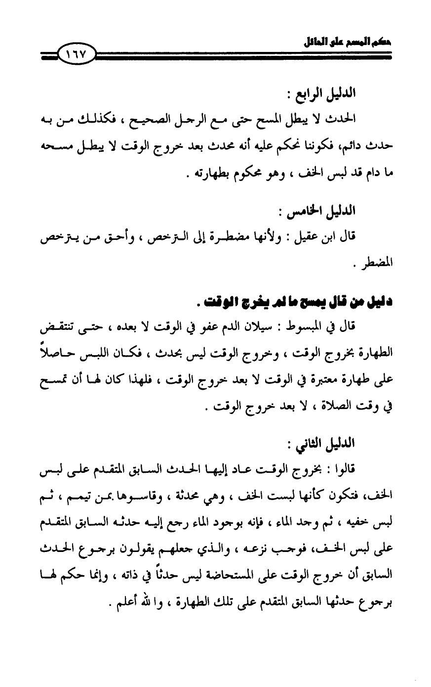 الحدث لا يبطل المسح حتى مع الرجل الصحيح، فكذلك من به حدث دائم، فكوننا نحكم عليه أنه محدث بعد خروج الوقت لا يبطل مسحه ما دام قد لبس الخف، وهو محكوم بطهارته.