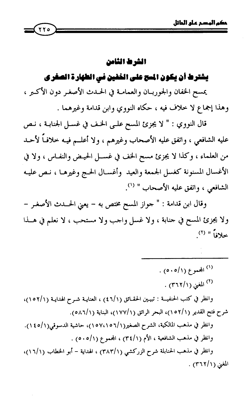 وقال ابن قدامة: " جواز المسح مختص به - يعني الحدث الأصغر - ولا يجزئ المسح في جنابة، ولا غسل واجب ولا مستحب، لا نعلم في هذا خلافاً " (¬2).