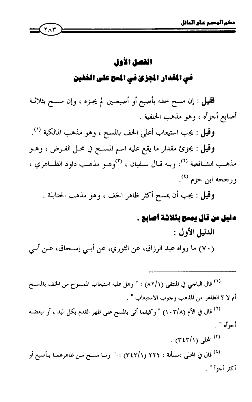 (¬4) قال في المحلى: مسألة: 222 (1/ 343): " وما مسح من ظاهرهما بأصبع أو أكثر أجزأ ".