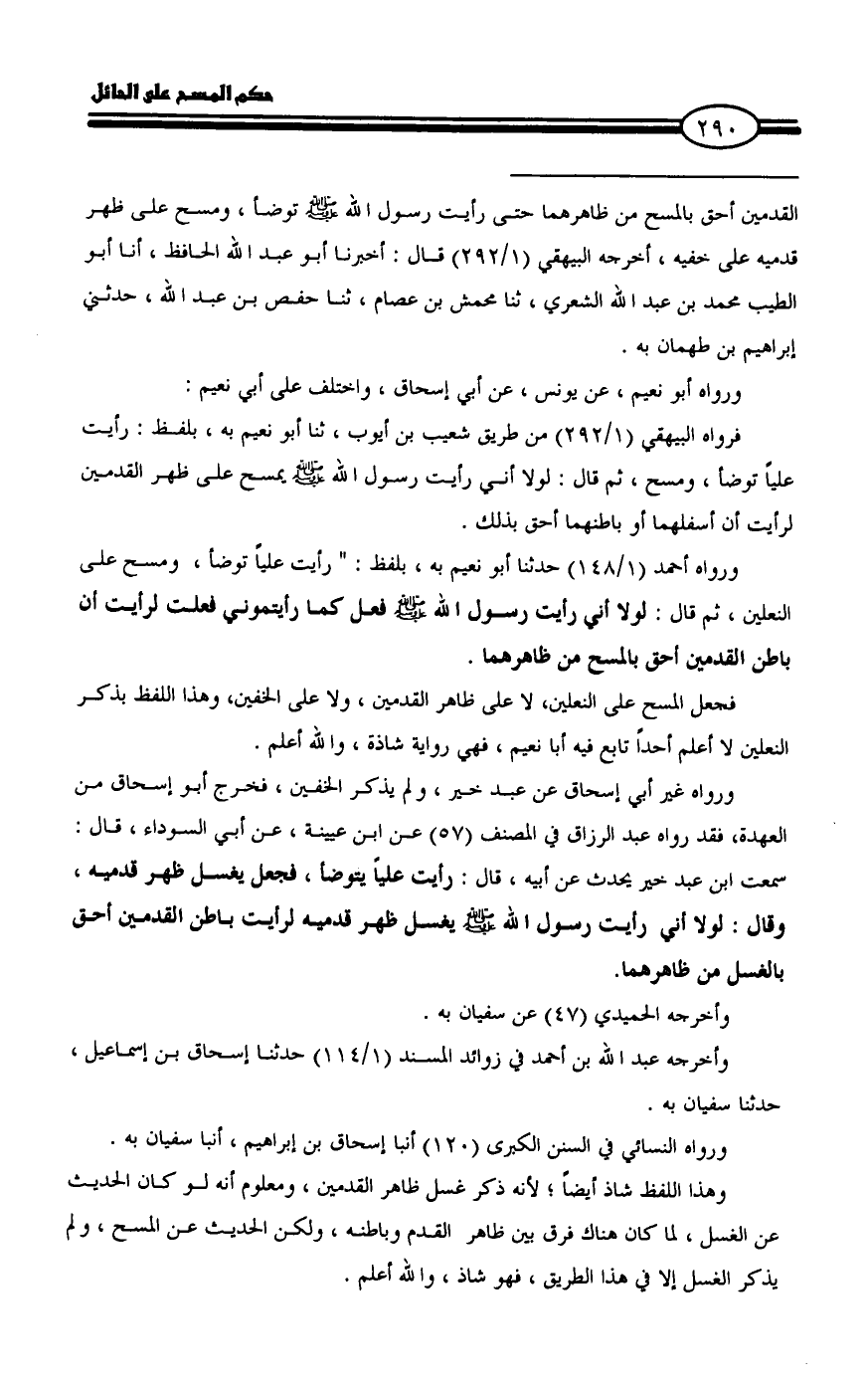 ورواه غير أبي إسحاق عن عبد خير، ولم يذكر الخفين، فخرج أبو إسحاق من العهدة، فقد رواه عبد الرزاق في المصنف (57) عن ابن عيينة، عن أبي السوداء، قال: سمعت ابن عبد خير يحدث عن أبيه، قال: رأيت علياً يتوضأ، فجعل يغسل ظهر قدميه، وقال: لولا أني رأيت رسول الله - صلى الله عليه وسلم - يغسل ظهر قدميه لرأيت باطن القدمين أحق بالغسل من ظاهرهما.