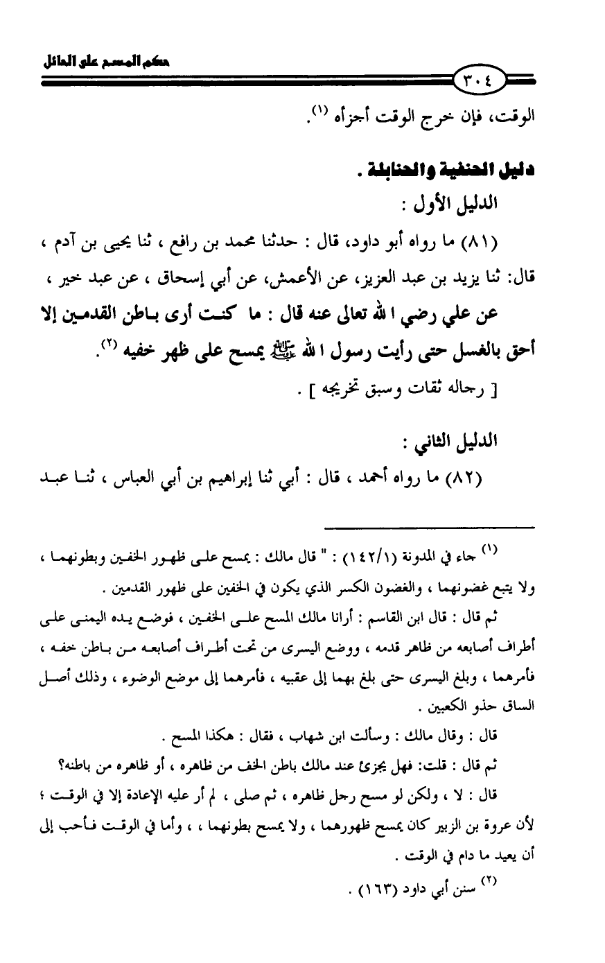 عن علي رضي الله تعالى عنه قال: ما كنت أرى باطن القدمين إلا أحق بالغسل حتى رأيت رسول الله - صلى الله عليه وسلم - يمسح على ظهر خفيه (¬2).