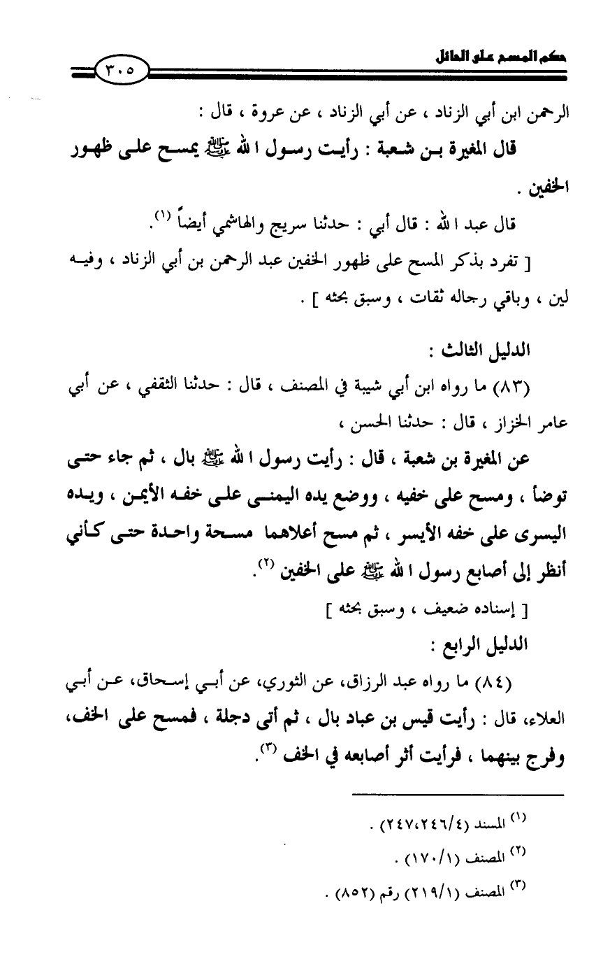 قال المغيرة بن شعبة: رأيت رسول الله - صلى الله عليه وسلم - يمسح على ظهور الخفين.