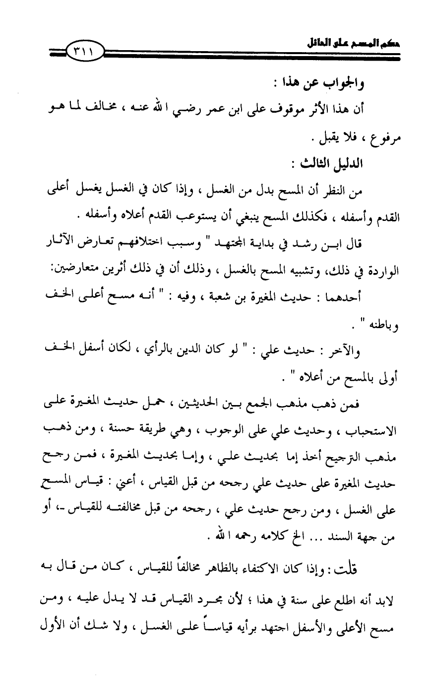 والآخر: حديث علي: " لو كان الدين بالرأي، لكان أسفل الخف أولى بالمسح من أعلاه ".