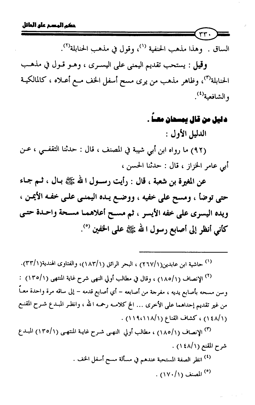 (¬2) الإنصاف (1/ 185)، وقال في مطالب أولي النهى شرح غاية المنتهى (1/ 135): وسن مسحه بأصابع يديه، مفرجة من أصابعه - أي أصابع قدمه - إلى ساقه مرة واحدة معاً من غير تقديم إحداهما على الأخرى ... الخ كلامه رحمه الله، وانظر المبدع شرح المقنع (1/ 148)، كشاف القناع (1/ 118،119).