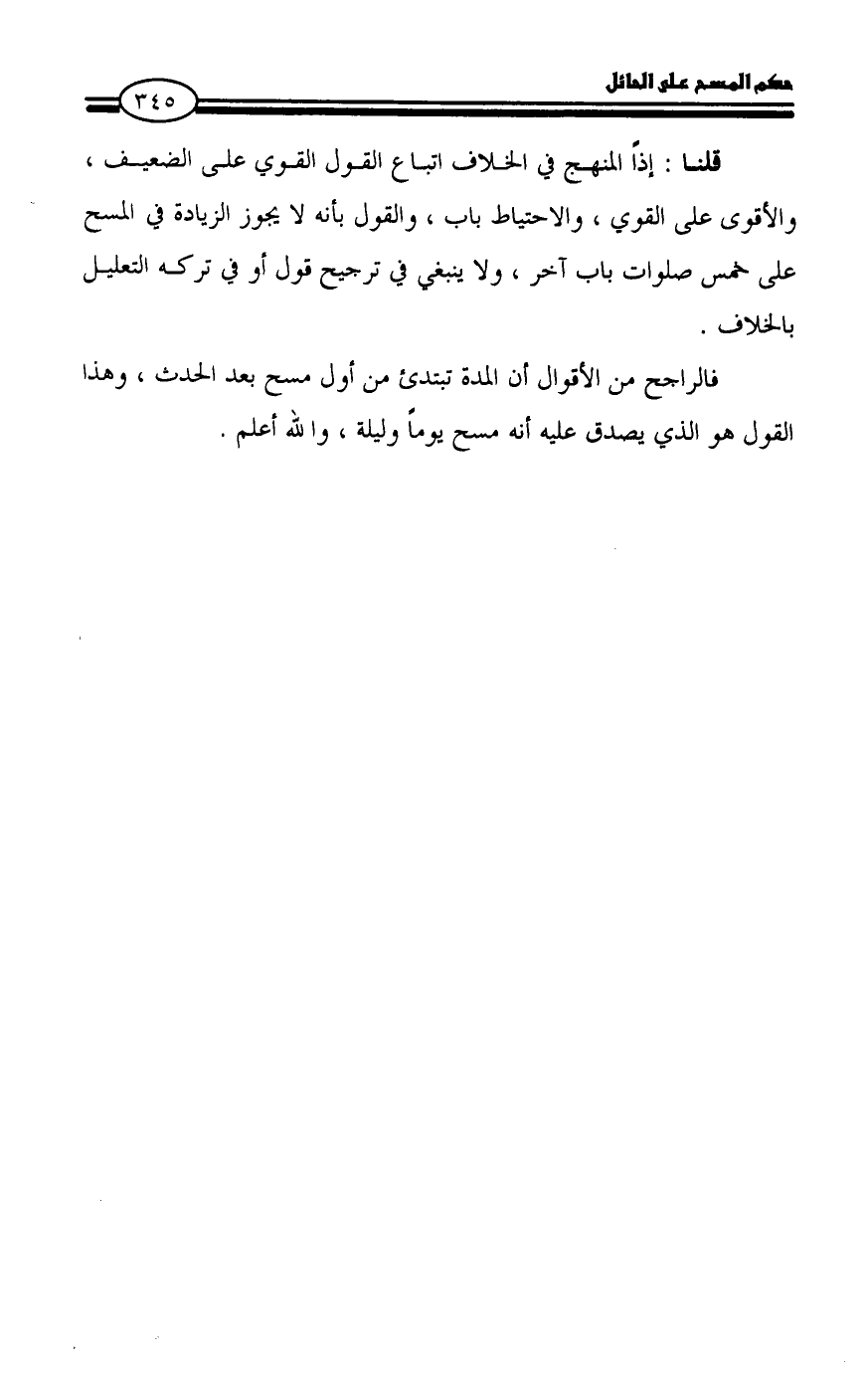 قلنا: إذاً المنهج في الخلاف اتباع القول القوي على الضعيف، والأقوى على القوي، والاحتياط باب، والقول بأنه لا يجوز الزيادة في المسح على خمس صلوات باب آخر، ولا ينبغي في ترجيح قول أو في تركه التعليل بالخلاف.
