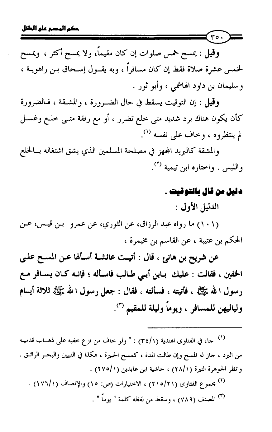 عن شريح بن هانئ، قال: أتيت عائشة أسألها عن المسح على الخفين، فقالت: عليك بابن أبي طالب فاسأله؛ فإنه كان يسافر مع رسول الله - صلى الله عليه وسلم -، فأتيته، فسألته، فقال: جعل رسول الله - صلى الله عليه وسلم - ثلاثة أيام ولياليهن للمسافر، ويوماً وليلة للمقيم (¬3).