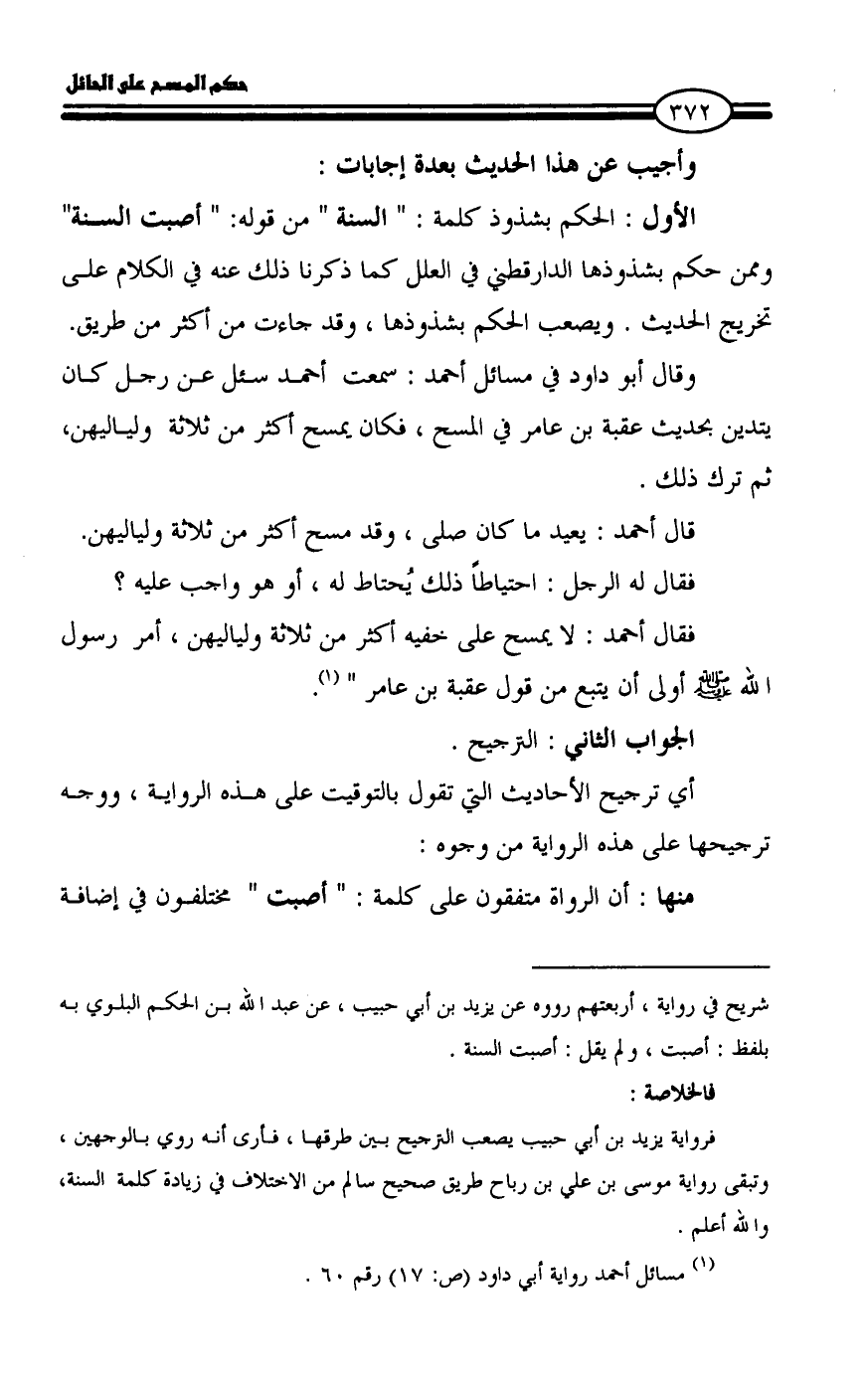 وقال أبو داود في مسائل أحمد: سمعت أحمد سئل عن رجل كان يتدين بحديث عقبة بن عامر في المسح، فكان يمسح أكثر من ثلاثة ولياليهن، ثم ترك ذلك.