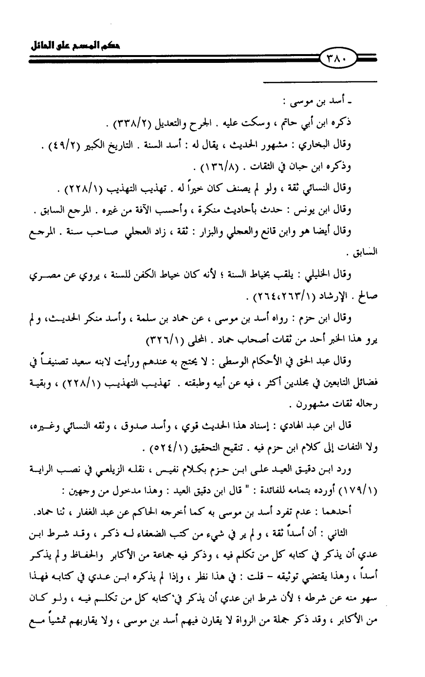 الثاني: أن أسداً ثقة، ولم ير في شيء من كتب الضعفاء له ذكر، وقد شرط ابن عدي أن يذكر في كتابه كل من تكلم فيه، وذكر فيه جماعة من الأكابر والحفاظ ولم يذكر أسداً، وهذا يقتضي توثيقه - قلت: في هذا نظر، وإذا لم يذكره ابن عدي في كتابه فهذا سهو منه عن شرطه؛ لأن شرط ابن عدي أن يذكر في كتابه كل من تكلم فيه، ولو كان من الأكابر، وقد ذكر جملة من الرواة لا يقارن فيهم أسد بن موسى، ولا يقاربهم تمشياً مع =