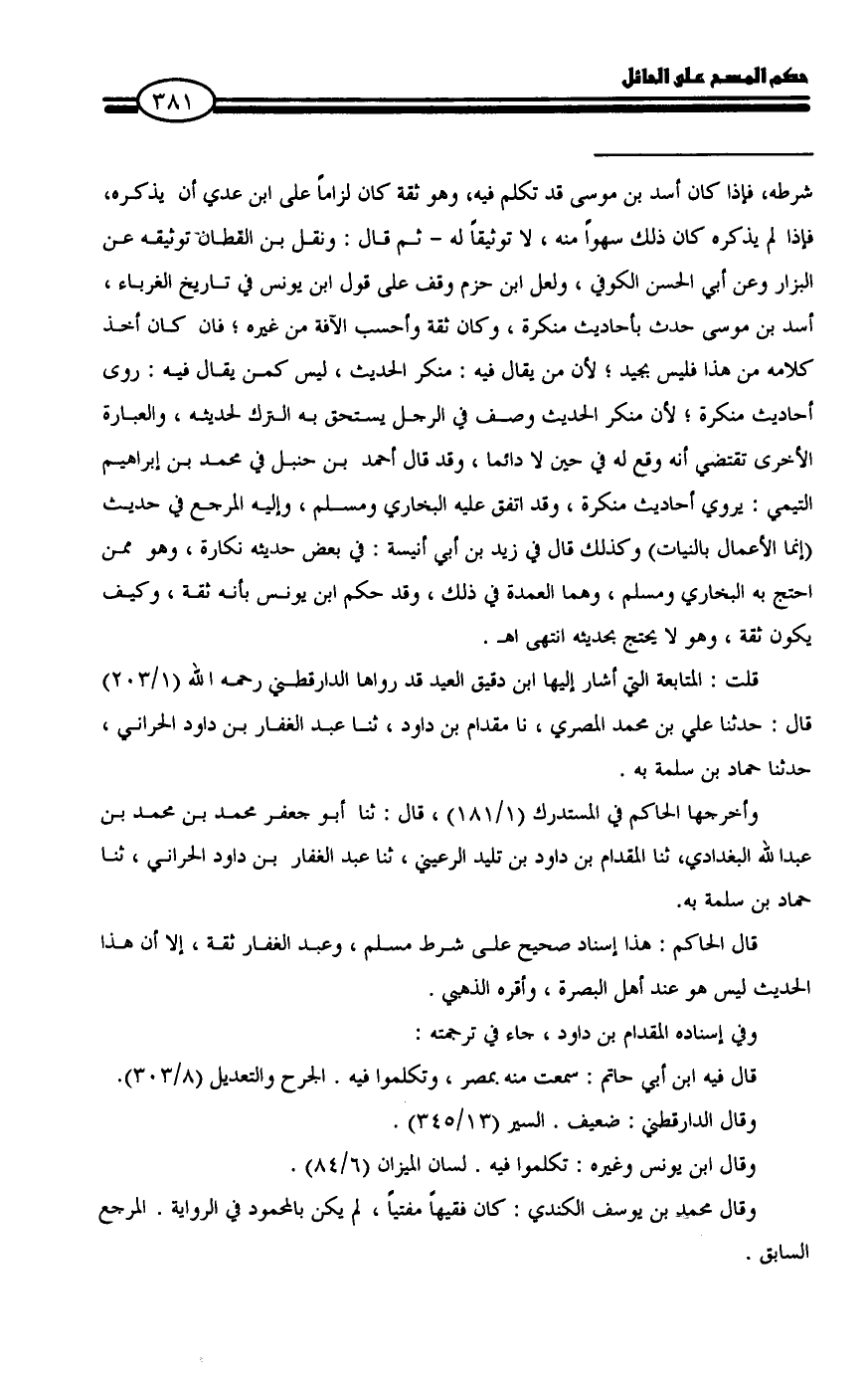 = شرطه، فإذا كان أسد بن موسى قد تكلم فيه، وهو ثقة كان لزاماً على ابن عدي أن يذكره، فإذا لم يذكره كان ذلك سهواً منه، لا توثيقاً له - ثم قال: ونقل بن القطان توثيقه عن البزار وعن أبي الحسن الكوفي، ولعل ابن حزم وقف على قول ابن يونس في تاريخ الغرباء، أسد بن موسى حدث بأحاديث منكرة، وكان ثقة وأحسب الآفة من غيره؛ فان كان أخذ كلامه من هذا فليس بجيد؛ لأن من يقال فيه: منكر الحديث، ليس كمن يقال فيه: روى أحاديث منكرة؛ لأن منكر الحديث وصف في الرجل يستحق به الترك لحديثه، والعبارة الأخرى تقتضي أنه وقع له في حين لا دائما، وقد قال أحمد بن حنبل في محمد بن إبراهيم التيمي: يروي أحاديث منكرة، وقد اتفق عليه البخاري ومسلم، وإليه المرجع في حديث (إنما الأعمال بالنيات) وكذلك قال في زيد بن أبي أنيسة: في بعض حديثه نكارة، وهو ممن احتج به البخاري ومسلم، وهما العمدة في ذلك، وقد حكم ابن يونس بأنه ثقة، وكيف يكون ثقة، وهو لا يحتج بحديثه انتهى اهـ.